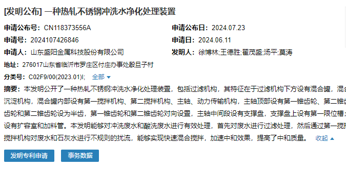 2024年7月23日,山東盛陽金屬科技股份有限公司成功申請(qǐng)一項(xiàng)名為“一種熱軋不銹鋼沖洗水凈化處理裝置”專利,申請(qǐng)公布號(hào)為CN118373556A,申請(qǐng)日期為2024年6月11日。