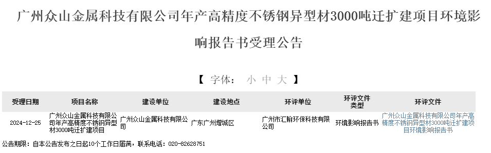 2024年12月25日,廣州市生態(tài)環(huán)境局受理廣州眾山金屬科技有限公司年產(chǎn)高精度不銹鋼異型材3000噸遷擴建項目環(huán)境影響報告書并對外進行公告,公告期:10個工作日。