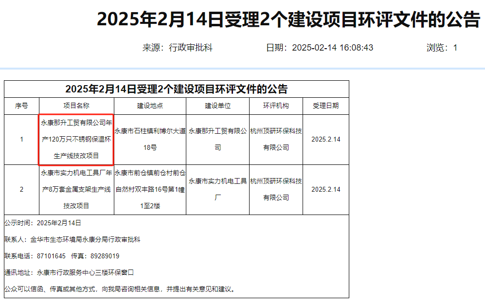2025年2月14日,金華市生態(tài)環(huán)境局永康分局受理永康那升工貿(mào)有限公司年產(chǎn)120萬只不銹鋼保溫杯生產(chǎn)線技改項目環(huán)境評價報告表并對外進行公示。